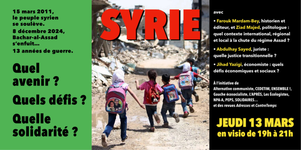 ° ContreTemps, n°64, « Syrie, des bouleversements qu’il faut savoir accompagner », entretien avec Firas Kontar. Et la déclaration de 65 Syriens et Syriennes « L’ère de la tyrannie est révolue, et les Syriens n’accepteront plus jamais de revivre les souffrances du passé ».